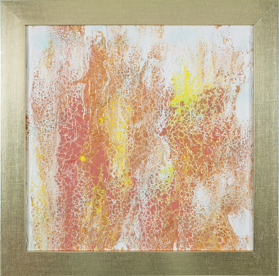 Dahlia was created using acrylic paint, painters caulk, silicone oil, pouring medium, and varnish on canvas board. It comes framed in gold without glass.