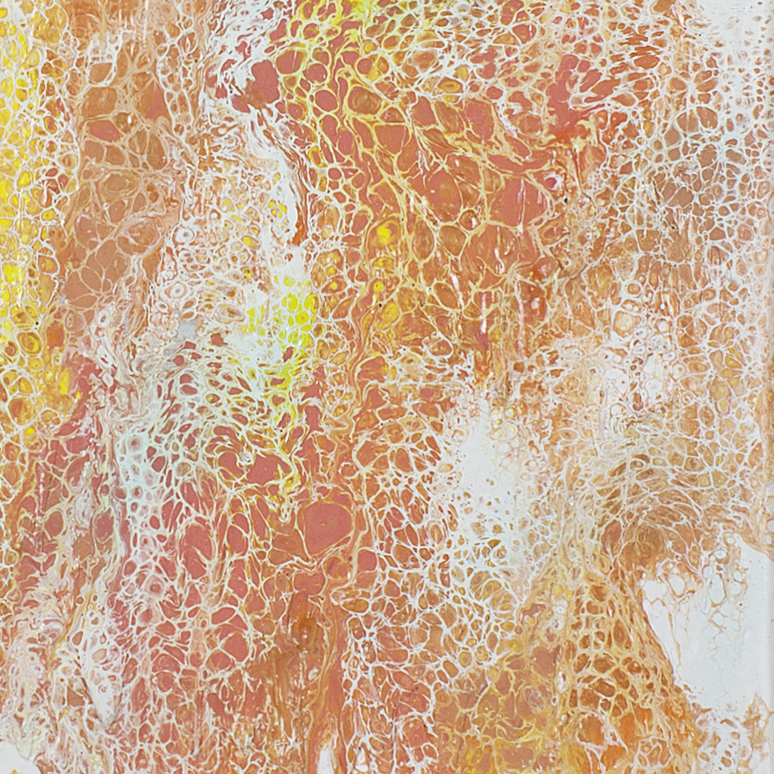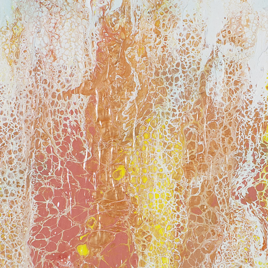 I had never done a pour painting over a textured surface so I honestly wasn’t sure how it would work. The pouring medium is rather thick so the paint held its cells while drying. The white was translucent enough that a small amount of blue from the previous painting is visible in certain areas. It gives the piece a nice unexpected color range.