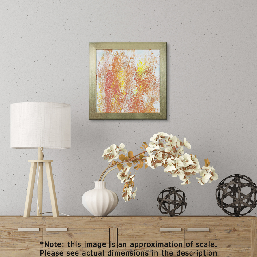 This painting comes framed in gold without glass. The painting has a slight gloss to it which the glass interferes with. The textured nature of the painting would be lost under glass so I removed it. If you dislike my framing choice, I’m happy to sell the painting unframed, with the cost deducted. Since this is a canvas board, the painting does need a frame to hang. The canvas board is 12″ x 12″ so custom framing isn’t necessary if you’d like to reframe it.