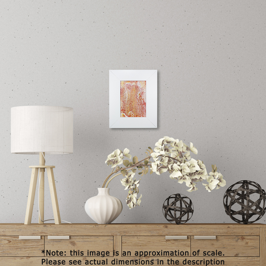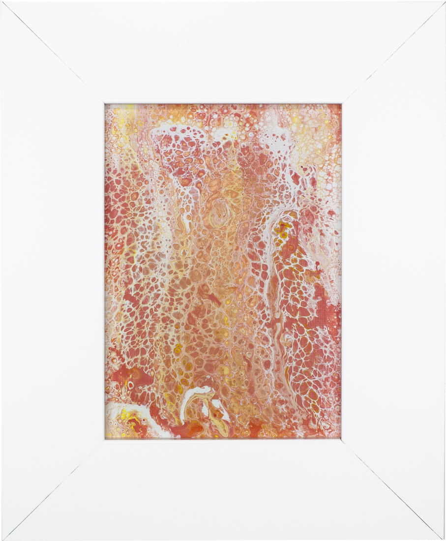 Gemini was created using acrylic paint, pouring medium, silicone oil, and varnish on canvas board. Comes framed in white, without glass.