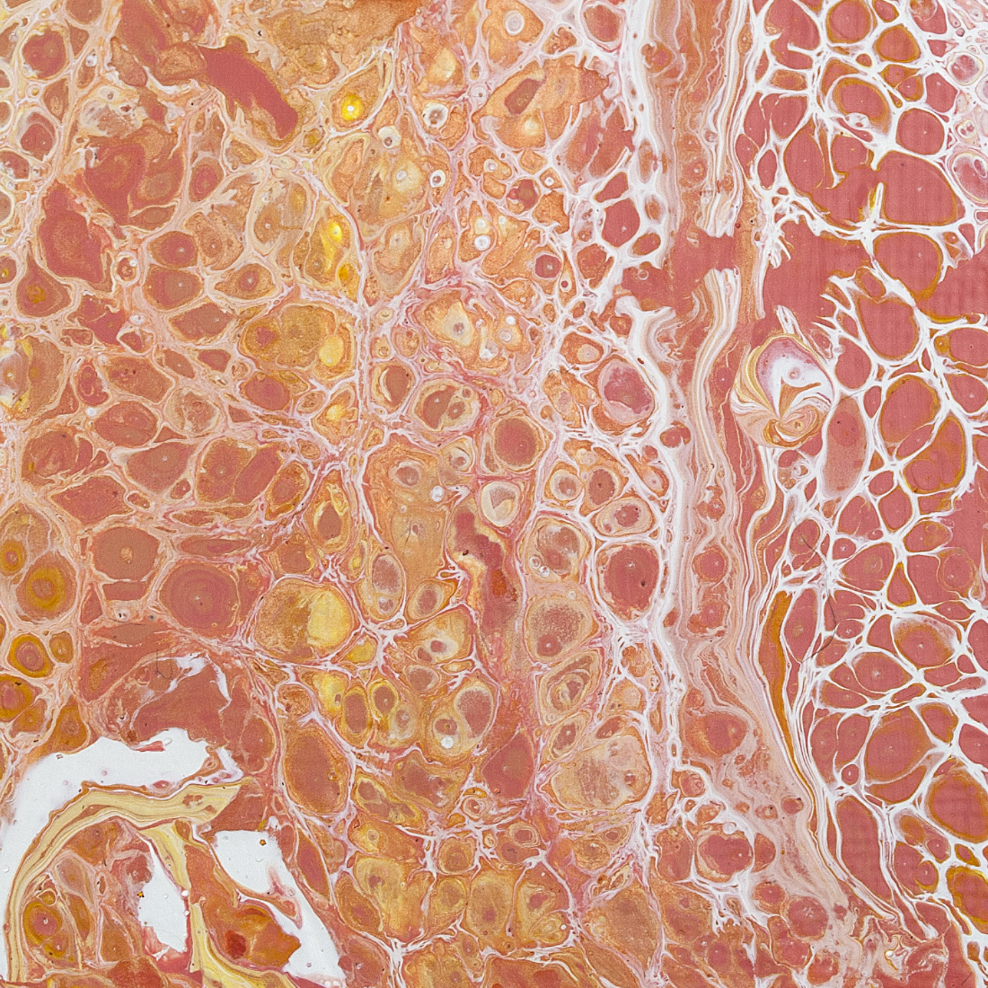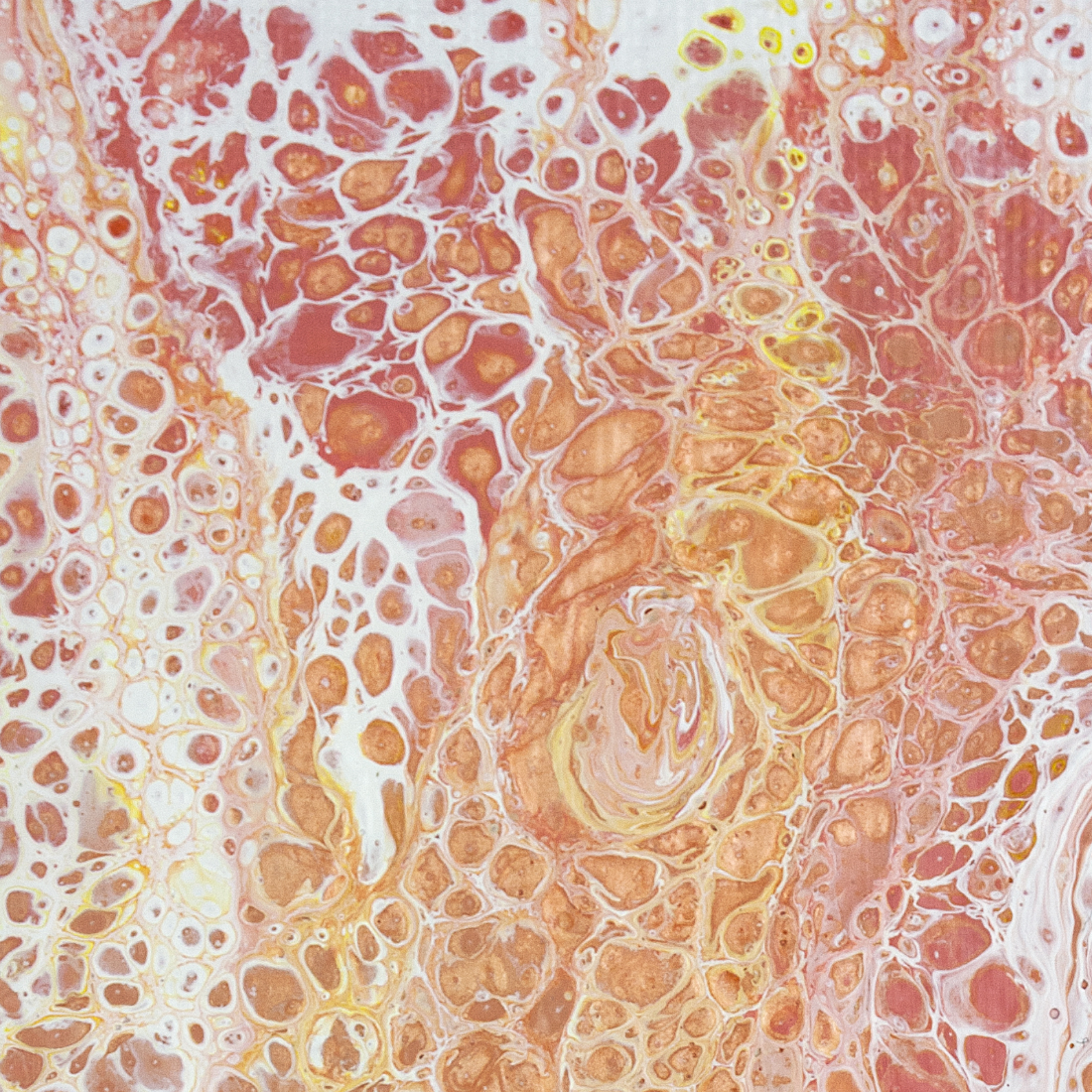 Both Gemini and Dahlia were pour paintings that also used the swipe technique. After doing the initial pour, you take one color (white in the case) and swipe it across the rest of the pour. It makes the beautiful lacy cell structure you see. I used coral, orange, and white acrylic paints, combined with pouring medium so it has a slightly glossy finish.